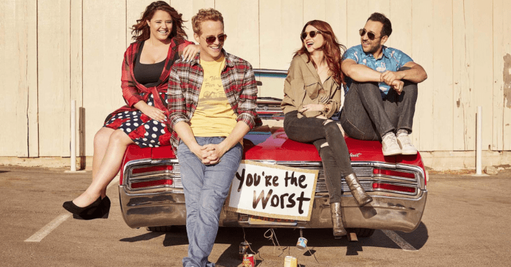 Er hat soeben versucht, die Hochzeit seiner Ex-Freundin zu ruinieren, und wird aus dem Hotel geworfen. Sie wiederum hat der Braut ein Geschenk vom Gabentisch geklaut. Und nun treffen beide vor dem Hotel aufeinander und beschliessen bei einer gemeinsamen Zigarette, die Nacht zusammen zu verbringen. So beginnt die Serie «You’re the Worst» (Du bist das Letzte).